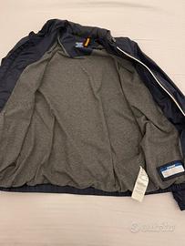 vestibilità slim, interno fodera in jersey di cotone grigio melange, impermeabile, antivento cuciture termonastrate, con 2 tasche con zip e una interna, cappuccio con zip interno al collo.