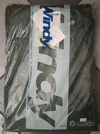 K Way "Windy" mod. Wacs tg. XL colore verde militare,foderato in jersey di cotone,cappuccio a scomparsa nel colletto,traspirante,antipioggia e antivento,richiudibile a marsupio tramite tasca con comodi elastici da legare in vita.