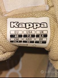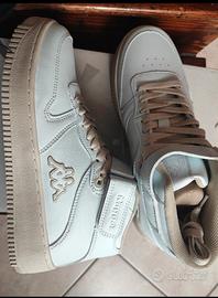 Vendo scarpe Kappa, modello sneakers alte. Sono di colore bianco e beige, e la taglia è 40. Le scarpe nuove,mai usate