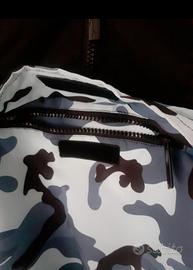 Provvista di tascone frontale con cerniera e di piccola zip laterale (vedi foto).
