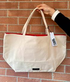Borsa nuova con cartellino originale, mai usata. In puro cotone, color panna all’esterno, rossa con utile tasca con cerniera all’interno.