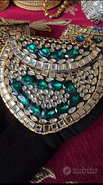 #indian jewellery #traditional #italia #san bonifacio #gioielli Questa è un’altra clutch ornata, simile nello stile ma ancora più vivace e appariscente. Ha una base nera completamente ricoperta da una fitta disposizione di pietre decorative incastonate in montature dorate. L’elemento più distintivo è il mix di grandi pietre colorate—rosse, blu, verdi, gialle e rosa—per lo più a forma di goccia, disposte sulla parte frontale in un motivo simmetrico, quasi come una collana. Intorno ci sono molte pietre più piccole e trasparenti che aggiungono ulteriore brillantezza e texture. I bordi sono rifiniti con elementi rettangolari simili a cristalli, che conferiscono alla borsa un aspetto strutturato, simile a uno scrigno gioiello. La parte superiore presenta una fascia curva decorativa che ricorda un gioiello, accentuandone il carattere lussuoso. Nel complesso, è una clutch d’impatto, perfetta per occasioni festive come matrimoni o feste, pensata per aggiungere colore e glamour a un outfit. This is another ornate clutch bag, similar in style but even more vibrant and eye-catching. It has a black base covered with a dense arrangement of decorative stones set in gold-toned frames. The standout feature is the mix of large, colorful gemstones—red, blue, green, yellow, and pink—mostly in teardrop shapes, arranged across the front in a symmetrical, almost necklace-like pattern. Surrounding them are many smaller clear stones that add extra sparkle and texture. The edges are bordered with rectangular crystal-like pieces, giving the bag a structured, jewel-box appearance. The top includes a curved, decorative band that resembles a piece of jewelry, enhancing its luxurious feel. Overall, it’s a bold, statement clutch, perfect for festive occasions like weddings or parties, designed to add a pop of color and glamour to an outfit. Translate in italian