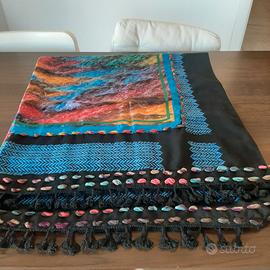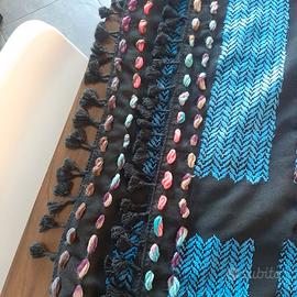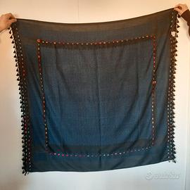 Kefiah in cotone jacquard nero e blu, doppiata con stampa a foulard di seta.