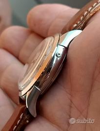 Splendido orologio svizzero Keystone 502 jumbo 37 mm. cassa inox con fondello a vite e movimento svizzero Felsa 694 col cambio rapido della data a pulsante. L'orologio è pari al nuovo, bellissimo, perfetto e funziona benissimo. Il marchio Keystone nasce nella seconda metà del 19° Secolo a Lancaster in Pennsylvania (USA). Pare venga registrato per la prima volta nel 1877 come fabbrica di "piccola orologeria, movimenti e casse per orologi", proprietà di Lancaster Watch Company, entrambe poi confluiranno in quella che diventerà poi la Hamilton Watch Company, nel 1892. Negli anni successivi il marchio venne registrato anche all'estero, in Germania e in Svizzera. Negli anni 1950/60, abbiamo questa splendida produzione di Orologi. La cassa racchiude uno splendido movimento. Il calibro Felsa BIDYNATOR è stato infatti il primo movimento automatico con dispositivo di carica bidirezionale della storia. Per gli interessati, non ho Tuttosubito, non scambio con Zenith, Longines, Universal Geneve, Eberhard, Squale. Consegno a mano o spedisco dopo aver ricevuto il pagamento tramite bonifico.