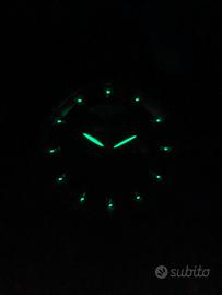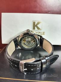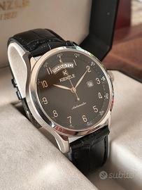 Orologio automatico Swiss made classico da uomo, ref. K610/6085, set completo con scatola originale, cassa acciaio 42 mm, movimento svizzero automatico Eta 2824-2 perfettamente funzionante, bellissimo quadrante nero con indici e sfere luminova e numeri arabi rodiati applicati, stile elegantemente militare, data a ore 3 e giorno esteso a ore 12, vetro zaffiro senza segni, water resistant 50 m, fondello con movimento a vista spettacolare, cinturino stampa cocco originale con fibbia acciaio con logo, condizioni ottime. Viene fornito nella elegante e robusta scatola originale con contro scatola in cartone. Non necessita di revisione perché al crono comparatore presenta valori nel range di tolleranza Eta e funziona tutto perfettamente con buona precisione. Valuto permute con Hamilton Khaki field e pilot o dress watch Seiko.