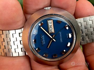 GUARDA ANCHE GLI ALTRI MIEI ANNUNCI,POTRESTI TROVARE IL SEGNATEMPO CHE STAI CERCANDO! SE L’INSERZIONE È VISIBILE L’OROLOGIO E’ DISPONIBILE LEGGI TUTTO! Prezzo non trattabile ! ( GENTILMENTE NON CHIEDETE ) Orologio Kienzle Diplomat vintage automatic Swiss Made Stupenda Cassa ufo mai lucidata da 39 millimetri ad esclusione della corona di carica,stupendo dial di un blu bellissimo con indici e scritte applicate datario ad ore tre ok,fondello a pressione ,corona doppio scatto ok,movimento originale automatico cal.Eta swiss made 2788 perfettamente funzionante e con buona tenuta del tempo e riserva di carica,bracciale originale con estensione originale a molla nella chiusura per polsi fino a 19 cm non possiedo scatola e garanzia PREZZO NON TRATTABILE NO PERDITEMPO NO scambi o permute con cronografo omega oro 18 kt zenith stellina sporto surf autosport tissot seastar navigator world time powermatic longines eberhard gran seiko king seiko squale mido breitling chronomat bulova 6139 bullhead ufo orient star diver vintage mondia philip watch carribean hydroconquest admiral scafograf scafodat universal geneve movado lorenz zodiac baume mercier girard perregaux constellation seamaster speedmaster super compressor el primero rainbow valjoux landeron extra fort broad arrow tcm tudor black bay perseo ultra chron pogue speed timer kakume challenge skx aqualand ufo traversetolo tazio nuvolari precision ocean callisto big size over sinn zodiac 30L dynamic snorkel lady tiffany mont blanc sideral afp 28800 6138 calculator multifort tv big date respirator ultra chron calatrava caravelle 007 009 011