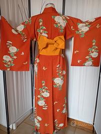 Kimono autentico giapponese in seta arancione marrone damasco floreale decorazione kiku (crisantemo) e farfalle. Cucito a mano e realizzato in tessuto di seta liscio morbido fluente e piacevole al tatto. Macchie e aloni nella fodera interna (foto) ottime condizioni tenuto conto del suo stato di capo antico ( periodo showa). Per conservare questo capo è stato utilizzato un prodotto antitarme e l'odore si può percepire. La cintura hanaba Obi non è compresa. Lunghezza 145 cm dal centro della schiena al polso 61 cm profondità manica 55 cm larghezza aperto 133 cm, consigliato per una taglia S #kimonokimonio