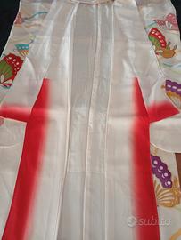 Furisode autentico giapponese in seta bianco magnolia con decorazione tema farfalla su filo d'erba, dettagli ricamati con barrette dorate. Capo unico, cucito e decorato a mano elegante e raffinato. Qualche macchia piccola nelle maniche e sul davanti (foto) ottime condizioni. Per conservare questo capo è stato utilizzato un prodotto antitarme e l'odore si può percepire. La cintura hanaba Obi non è compresa
