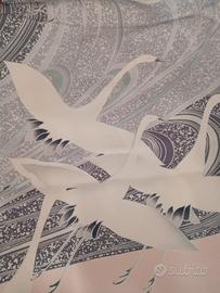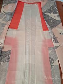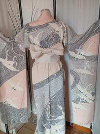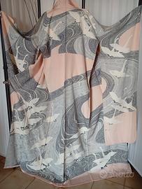 Kimono Furisode autentico giapponese antico in seta base rosa fiori di ciliegio con decorazione sfumata grigio e bianco tema gru con dettagli ricamati con barrette argento. Cucito e ricamato a mano realizzato in tessuto di seta crepe fluente. La gru simboleggia unione durata, infatti è una specie monogamia e viene spesso utilizzata come decorazione su kimono e accessori nuziali. Questo kimono Furisode elegante e raffinato è un capo unico e potrebbe essere un originale abito da sposa. Qualche piccola macchia (foto). In doppio colletto in seta kirimen rosa pesca e la cintura hanaba Obi sono compresi. Per conservare questo capo è stato utilizzato un prodotto antitarme e l'odore si può percepire. Lunghezza 156 cm dal centro della schiena al polso 66 cm profondità manica 115 cm larghezza aperto 140 cm. #furisodekimonio