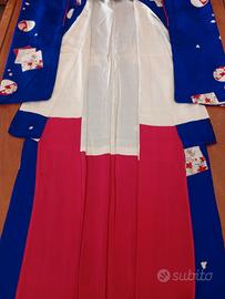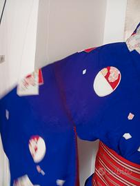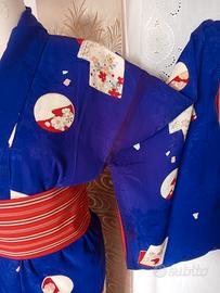 Kimono giapponese in seta viola porpora (attenzione! Il colore in foto sembra blu cobalto ma nella realtà è porpora) cucito e decorato a mano, realizzato in pregiata seta mon kinsha, liscia morbida e fluente. In alcuni punti di piega il colore ha assunto una tonalità più scura (foto) macchie e aloni nella fodera interna (foto) per conservare questo capo è stato utilizzato un prodotto antitarme e l'odore si può percepire. La cintura hanaba Obi non è compresa.