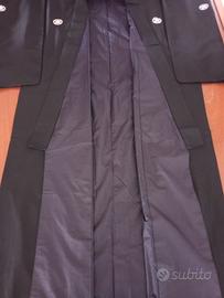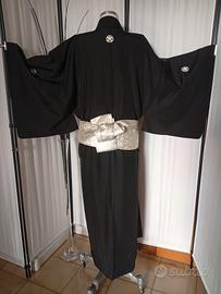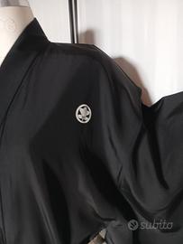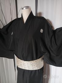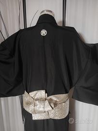 Kimono autentico giapponese antico, cucito a mano e realizzato in pregiata seta habutae, tipo di raso liscio morbido e molto piacevole al tatto. 5 kamon (stemma di famiglia) simbolo araldico tachibana mon , mandarino selvatico, pianta sempreverde che collega il suo fiore tra gli embemi di longevità e immortalità , kamon scelto da famiglie di dignitari di corte e samurai. La cintura kaku Obi non è compresa. Ottime condizioni. Per conservare questo capo è stato utilizzato un prodotto antitarme e l'odore si può percepire. Lunghezza 140 cm dal centro della schiena al polso 68 cm profondità manica 50 cm larghezza aperto 146 cm #kimonouomokimonio #mankimonokimonio