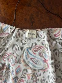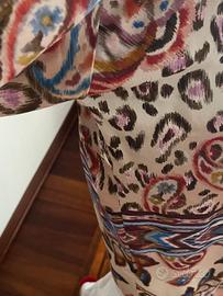 Chimono elegante di grande effetto, bei colori, bordato sul davanti da una striscia geometrica a contrasto. Fondo beige sabbia. Leggero in viscosa. Marchio Dixie, taglia M