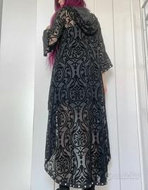 Kimono giacca / kimono nero lungo, trasparente con decorazioni in velluto.