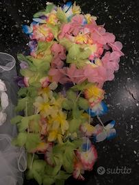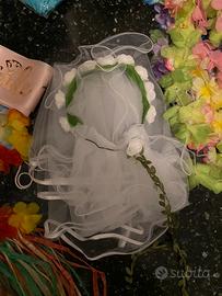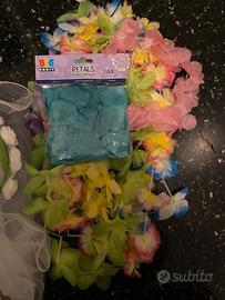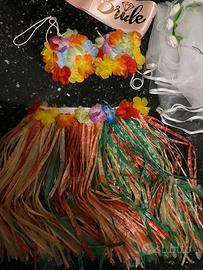 Costume da hawaiana (gonna + reggiseno); 5 collane hawaiane e braccialetto + fascia, cerchietto e occhiali “bride to be” + velo da sposa e coroncina + petali finti
