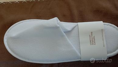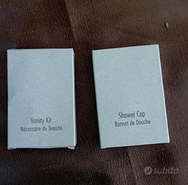 Kit da viaggio composto da sei pezzi - maschera per occhi refrigerante - pantofola chiusa in spugna bianca - lozione idratante per il corpo - cuffia doccia - spazzolino da denti con dentifricio