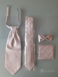 Vendo Kit completo da cerimonia, di colore grigio perla, come nuovo, usato una sola volta, perfetto, composto da gilet elegante (Tg XXL, regolabile fino alla taglia 50-52), due cravatte, un farfallino e il fazzoletto tutto in coordinato.