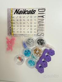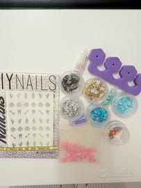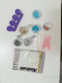 Bellissimo kit per decorare le unghie! Include adesivi per unghie e diversi vasetti di glitter e brillantini colorati, perfetti per creare nail art uniche.