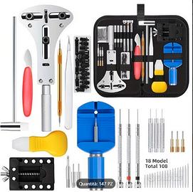 Kit di attrezzi per orologi. Per manutenzione e piccole riparazioni sugli orologi da polso. Contiene gli strumenti di base per aprire-chiudere i fondelli sia a vite che a pressione, allungare-accorciare i cinturini, perni di sostituzione delle maglie e altro. Prodotto nuovo, con custodia, mai usato. Il prezzo non è trattabile. Altri articoli nelle mie offerte. Visitate il mio profilo.