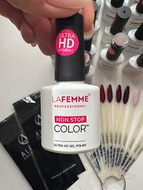 Vendo kit semipermanente La Femme professionnel. Il kit comprende tutto il necessario: primer, basi, top coat e vari smalti swatchati sulle tip. Alcuni colori sono stati aperti anche solo per fare le tip,altri mai aperti