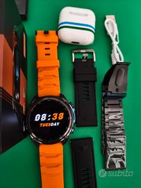 Vendo nuovissimo e mai usato questo rugged smartwatch KKtick tank t5. L'ho ricevuto ieri, sono disponibile a mostrare la ricevuta di arrivo e perciò mai usato. È ancora nuovo nella scatola originale. Dotato di 3 cinturini, 1 arancio, 1 nero e 1 nero di acciaio e anche un paio di cuffie wireless. Lo vendo perché personalmente non mi piace esteticamente. Informatevi su YouTube o sul web sulle recensioni, per questo prezzo é un ottimo rugged. Dotato di GPS, torcia esterna, ed un sacco di funzioni che sono lunghe da elencare. Schermo da 51" amoled