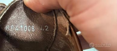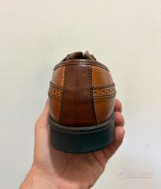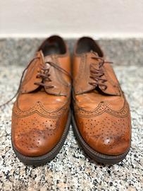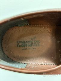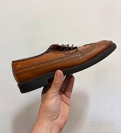 Scarpe stringate stile brogue in pelle marrone Klondike, made in Italy. Modello classico elegante con lavorazione traforata (brogue/oxford), ideale per outfit formali o smart casual. Taglia 42. Condizioni usate: la pelle presenta segni di utilizzo visibili soprattutto sulla punta con macchie e usura, oltre a pieghe naturali da utilizzo. Struttura comunque solida e ancora perfettamente indossabili. Perfette per chi cerca scarpe eleganti vintage in vera pelle con carattere.