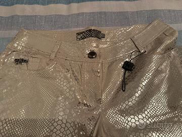 Pantaloni argento fondo beige marca Koralline fabbrica italiana nuovi con cartellino, particolare effetto pitone, foderato internamente.