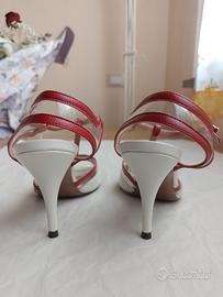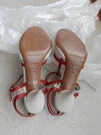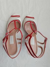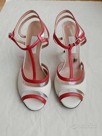 L'AUTRE CHOSE scarpe peep toe slingback (spuntate con tallone aperto), cinturino a "T" Made in Italy n.38 NUOVE, MAI usate, con sigillo del venditore; tomaia in vera pelle (nappa) bianca con profili rossi e PVC trasparente, fodera e sottopiede in vera pelle, suola in vero cuoio. Stile pinup, retro, anni '50, vintage, tango. L'AUTRE CHOSE, marchio marchigiano (terra del famoso distretto calzaturiero), rappresenta l'eccellenza del Made in Italy: materiali pregiati e tradizione artigianale danno vita ad un prodotto nuovo e curato nei minimi particolari. Prezzo d'acquisto € 239,00.