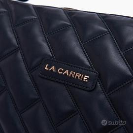 La Carrie realizzata in ecopelle trapuntata con chiusura tramite zip, logo applicato frontalmente, manico intrecciato e tracolla removibile.