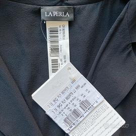 La Perla Prototipo/Capo di campionario Abito Corto Nero in Seta Con Pizzo Dorato. Un abito nero abbottonato in stile camicia, elegante e sofisticato, con un look audace ma versatile, estremamente facile da indossare. Nel mezzo del vestito sono presenti dei passanti e con una cintura si può creare un effetto camicia-gonna, come se fossero due capi di abbigliamento staccati. La parte inferiore del vestito è una gonna semplice a tubino con delle strisce di pizzo ricamato color oro e nero che danno al luce al vestito. L’orlo del vestito è rifinito da un pizzo nero raffinato aggiungendo un tocco di sensualità all’abito. Un capo per ogni momento ed ogni occasione, meglio ancora se indossato con tacchi alti. Taglia XS ma veste S.