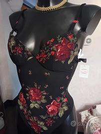 nuovo con etichetta rose aperte sul davanti e boccioli di rosa dietro su fondo nero taglia 2