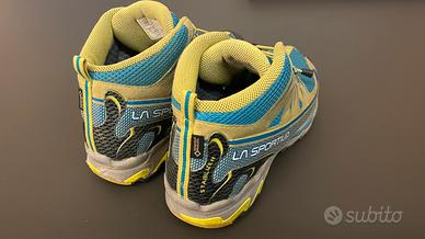 Scarpe da trekking “junior” taglia 40 giallo verdi, usate poco quindi con segni tipici di usura normale, ben tenute, mai lavate ma pulite per via di un utilizzo sporadico e solo su strade poco accidentate. Bellissime, adatte a chi tende a scegliere il top ad un prezzo di autentico affare.