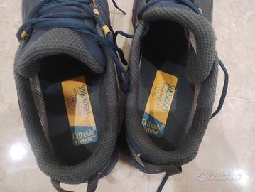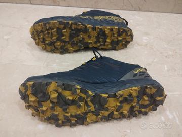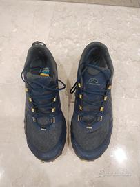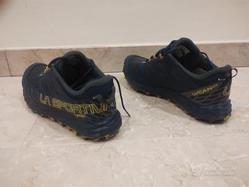 Scarpe da Trail running de La Sportiva modello Lycan GTX, totalmente impermeabili grazie alla membrana in Gore-Tex. Ideali per la corsa off-road anche nei mesi invernali. Usate un paio di volte (i tasselli non sono consumati), e in punta ho fatto mettere un rinforzo in pelle per evitare di consumare l'interno con lo sfregamento dell'unghia dell'alluce. Vendute con scatola originale.