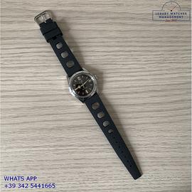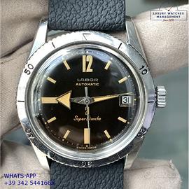 Labor Diver Super Etanche 5992 acciaio, anno produzione 1960 circa, ghiera bidirezionale in acciaio a scala graduata, vetro plastica bombato, quadrante tropicale colore marrone con data indici e sfere al trizio, movimento meccanico a carica automatica, cinturino Tropic in gomma colore nero con fibbia acciaio generica.