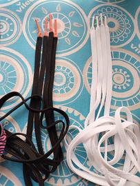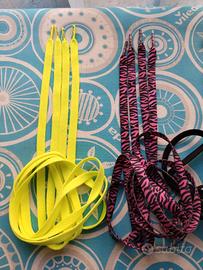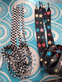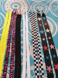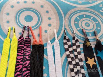 Sei paia di simpatici lacci variopinti per scarpe sportive tipo Converse, sneackers a cinque, sei o otto occhielli. Sono tutti nuovi tranne quello a quadretti e quello nero con stelle multicolor che comunque sono stati usati pochissimo e non presentano danni. Lunghezze: Quadri bianco e nero 132 cm – Neri con stelle multicolor 135 cm - Neri punte rosa 118 – Zebrato rosa e nero 125 cm - Giallo Fluorescente 130 cm – Bianco 162 cm.. Altezza dei lacci tutti 1cm tranne quello a stelle multicolor che è alto 1,8 cm. Si vende tutto in blocco a 20 euro oppure un solo laccio 5 euro.