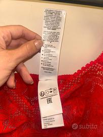 Rosso acceso dai bordi dritti con smerlo e microfibra in pizzo fantasia floreale elasticizzato, per questo ha un’ottima vestibilità e rimane comodo nel movimento. Spalline fini e regolabili, chiusura inferiore pratica con le clips automatiche e taglio a perizoma. Non rimane trasparente in quanto è foderato all’interno con un tulle color carne sulle coppe sfoderate e senza ferretto. Questo lo rende adattabile ad un uso non solo intimo ma anche ad uscite in serate abbinandolo a jeans, gonne o pantaloni eleganti.