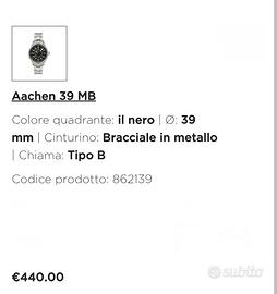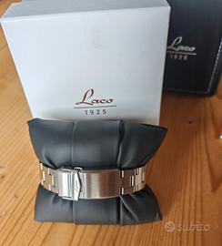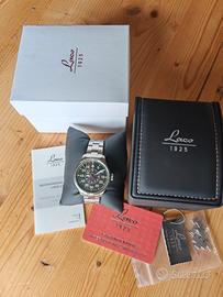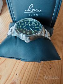 Laco Aachen flieger Pilot, orologio made in Germany, famoso per le eccezionali finiture e per il design storico di orologi da aviatore. - Movimento: Laco 2S (base Miyota 82S0) automatico, con fermo macchina - Riserva di carica: 42 ore - Cassa: 39 mm - Spessore: 11,5 mm - Lug-to-lug: 46,5 mm - Fondello: vetro zaffiro - Impermeabilità: fino a 5 ATM / 50 m - Quadrante: stile Type B (Navigator) con indicazione minuti grandi esterni e ore interne - Numeri e indici: trattamento Super-LumiNova - Vetro: zaffiro antigraffio - Bracciale: acciaio satinato - Chiusura: con logo e doppio pulsante - Larghezza anse: 18 mm - Full set L' orologio si trova in ottime condizioni. C'è qualche segnetto dovuto al normale utilizzo, avvenuto comunque in alternanza con altri pezzi e con l'attenzione di un appassionato Assicuro imballo accurato e spedizione immediata Non scambio e non permuto, nemmeno con iPhone, Ps4, Seiko, Citizen, Hamilton, Squale, Longines, Glycine, Yema, Vostok, Tudor, Oris, Mido, Rado, Doxa, Edox