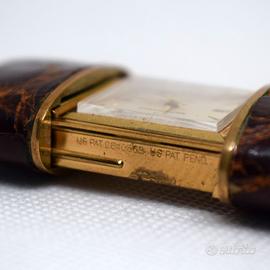 Cassa in metallo dorato e custodia in pelle marrone con motivo coccodrillo