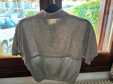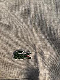 Lacoste maglia vintage cotone 100% donna grigia, colletto polo, manica corta. Taglio sottoseno morbido elastico sotto. Vestibilità mobida. Ottime condizioni. Taglia 4