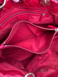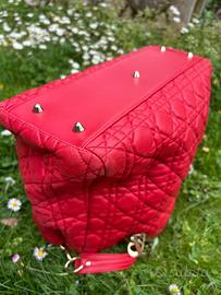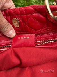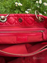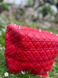 Borsa Lady Dior originale in pelle trapuntata cannage, colore rosso acceso con finiture dorate e charm D.I.O.R. Modello iconico della maison, elegante e strutturato, adatto sia per il giorno che per la sera. Dotata di doppi manici rigidi. Condizioni molto buone: pelle morbida e ben mantenuta, con normali segni d’uso visibili soprattutto sugli angoli e in alcune zone della superficie. Interno pulito, hardware in buono stato. Dettagli: • Materiale: pelle • Colore: rosso • Finiture: dorate • Tasca interna con zip Dimensioni: • Larghezza: 34 cm • Altezza: 26 cm • Profondità: 15 cm Non disponibile scatola o dust bag originali. Autenticità garantita. Prezzo leggermente trattabile.