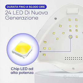 24 LED a lunga durata – Tecnologia avanzata con distribuzione uniforme per polimerizzare senza zone d’ombra.