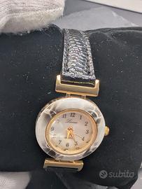 Grazioso orologio da donna Lamur vintage, caratterizzato da quadrante in madreperla con numeri arabi e cassa bicolore con finitura dorata.