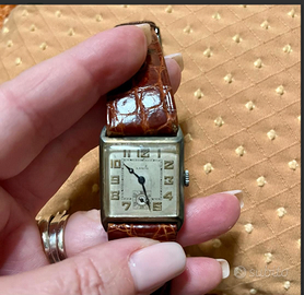 PREGIATO e RARO orologio da polso LANCO, ART DECO con cassa quadrata in argento e cinturino in coccodrillo marrone. VINTAGE riconducibile anni '20. CONDIZIONI: ottimo stato conservativo, proveniente da collezione privata di famiglia, sempre custodito con estrema cura ed esposto in vetrina.