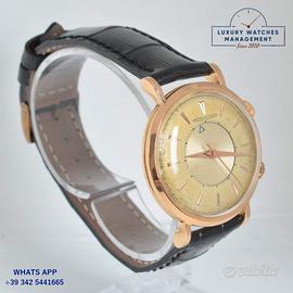 Jaeger LeCoultre Memovox Svegliarino da polso oro rosa 18KT, anno di produzione 1950 circa, vetro plastica bombato, quadrante bicolore avorio con disco interno girevole della sveglia, sfere a foglia e indici oro rosa, movimento meccanico a carica manuale, cinturino in pelle di alligatore colore nero con fibbia dorata Jaeger LeCoultre.
