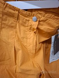 Stoffa Leggerissima, colore giallo ocra, modello con gamba dritta e pence, tasche laterali 100% cotone