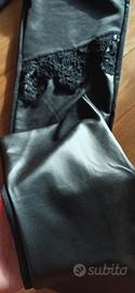 Splendidi leggings Calzedonia in tessuto spalmato effetto pelle (similpelle), caratterizzati da raffinati inserti in pizzo macramè sulle ginocchia. Il design combina uno stile rock-chic con un tocco femminile.