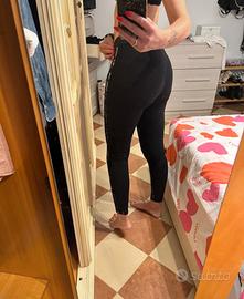 Vendo questi graziosi leggings con dettagli in pizzo. Il design è caratterizzato da un motivo a strisce verticali interne bianco/nere e da un motivo floreale in pizzo/traforato sul davanti. Questo mix crea un effetto visivo accattivante e slanciante.