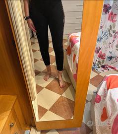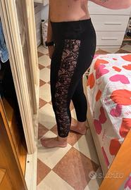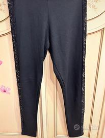 Vendo leggings eleganti con pizzo laterale, taglia M Sono realizzati in tessuto elasticizzato nero, garantendo una vestibilità aderente e confortevole. Il dettaglio distintivo è l'inserto verticale in pizzo nero traforato che corre lungo l'intera lunghezza di entrambe le gambe, dal fianco alla caviglia. Vestibilità aderente