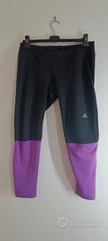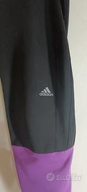 Leggings Adidas donna, colore nero con bande laterali a contrasto. Modello aderente e confortevole, ideale per sport o uso quotidiano. Tessuto elasticizzato che si adatta bene al corpo. Logo Adidas presente.