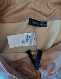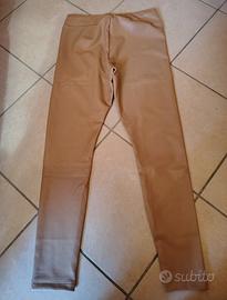 Questi leggings firmati Esmara sono il perfetto compromesso tra grinta e comodità. Realizzati in morbida similpelle color cammello, offrono un look contemporaneo e sofisticato grazie alla finitura leggermente opaca e alla silhouette fasciante che valorizza la figura. Il design è essenziale, con una vita alta elasticizzata che assicura comfort per tutto il giorno. All'interno, la fodera leggermente garzata li rende piacevoli sulla pelle e ideali per le mezze stagioni. Un dettaglio importante per la sostenibilità: il capo è certificato dal Global Recycled Standard, contenendo il 78% di poliestere riciclato. Nota sulle condizioni: Come visibile nel dettaglio in foto, il capo presenta dei piccoli segni scuri su una delle gambe (probabilmente un trasferimento di colore o sfregamento), che però non ne compromettono l'estetica generale se indossati con un maxi pull o un blazer lungo. #esmara #leggings #similpelle #fauxleather #camelstyle #modaetica #recycledfashion