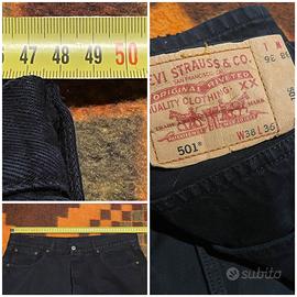 Levi’s 501 blu come da foto, usati pochissimo, vita 38 e lunghezza 36, cotone classico (non elasticizzato) leggermente più stretti ai fianchi rispetto ad altri pantaloni stessa marca stessa misura. allego foto di un altro paio di pantaloni neri (non in vendita) dove si evince che la larghezza vita è la stessa ma i fianchi di questi blu sono circa un paio di centimetri più stretti.